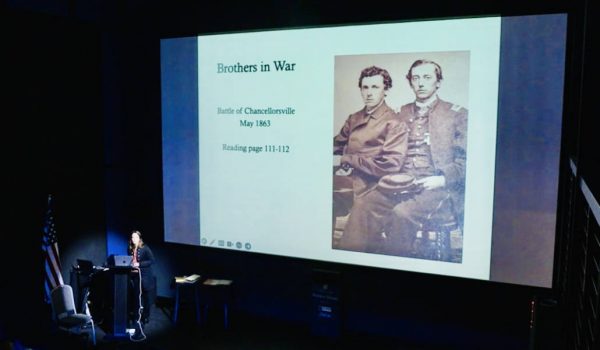 At Kent State University Press\'s 50th anniversary celebration, September 25, 2015, author Linda Spurlock (seated center, KSU Anthropology) speaks with KSU Press Director Will Underwood (right) as two graduate students look on. Standing at left, author Mark Seeman (KSU Anthropology Emeritus).